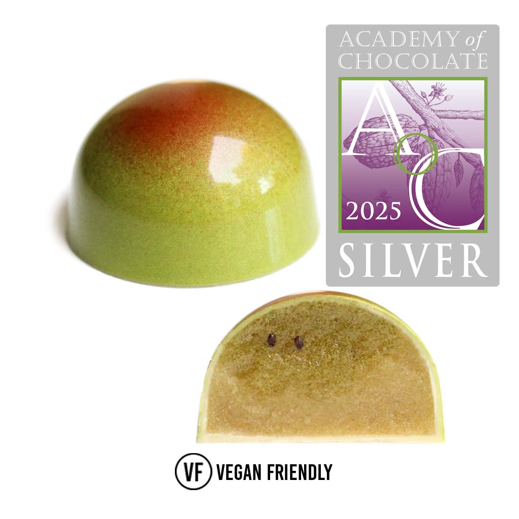 Ingredients: plant-based (almond) white couverture, kiwifruit couverture, kiwifruit, sugar, vegan butter, glucose, cocoa butter, invert sugar, pectin, citric acid, tonka bean (Dipteryx odorata)