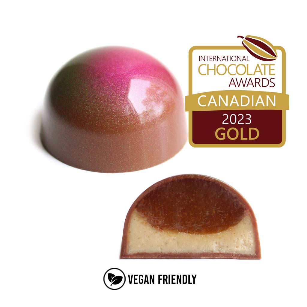 Ingrédients : chocolat au lait végétalien, sucre, pâte de prune japonaise, pâte de sésame blanc, glucose, beurre de cacao, beurre végétalien, couverture d'amandes, huile de pépins de raisin, sel marin.
