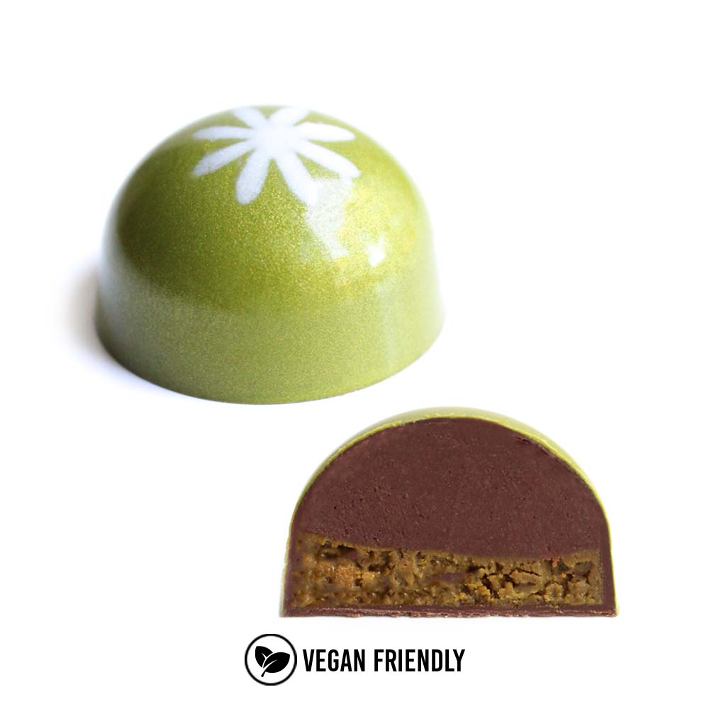 Inspiré du baklava, ce bonbon se compose d'une couche croquante incroyablement riche à la pistache, accompagnée d'une ganache au chocolat à la fleur d'oranger.