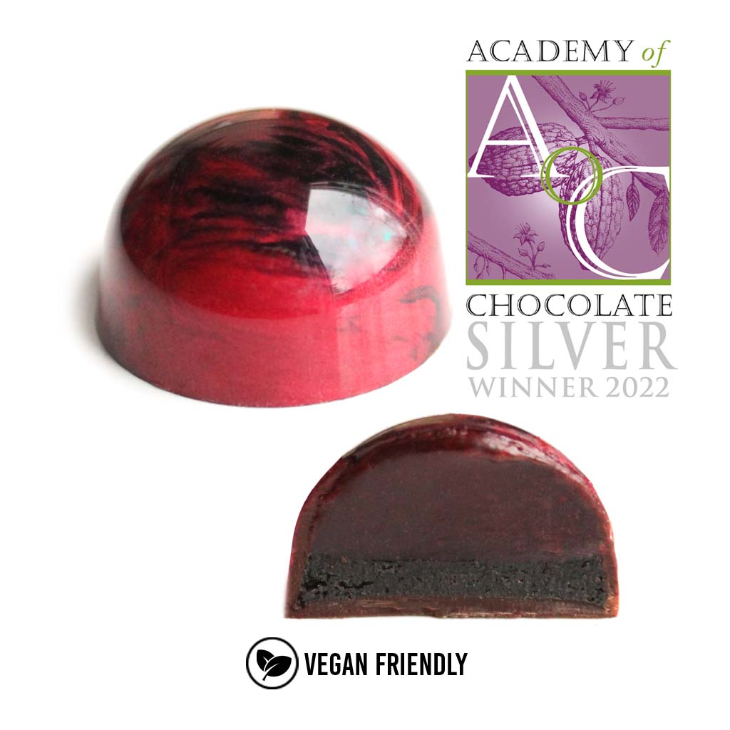 Caramel à la framboise entièrement naturel associé à une « duja » au sésame noir dans une coque de chocolat noir. Bien équilibré et fruité, avec une finale riche et satisfaisante.