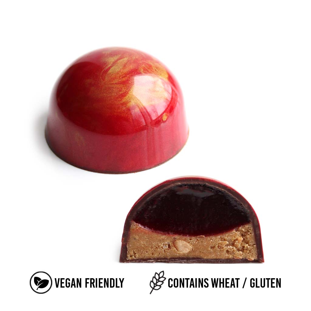 Ingrédients : chocolat au lait végétal (amandes), purée de framboises, pâte à tartiner au beurre, sucre, biscuits, noisettes, beurre de cacao, pectine, cannelle, acide citrique.
